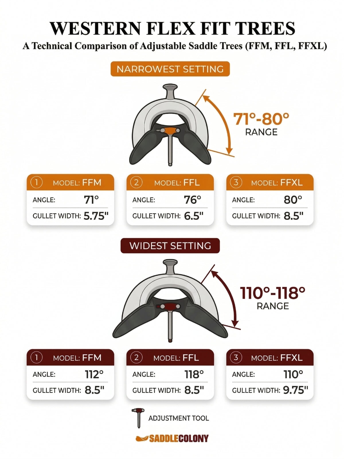 This model is fully adjustable from extra narrow to extra-wide. Easily adjust your saddle as your horse is going through muscular structure changes or while it's still growing, when you pause over winter or many other reasons why a dynamically moving horse will benefit from our enhanced saddle mechanisms.