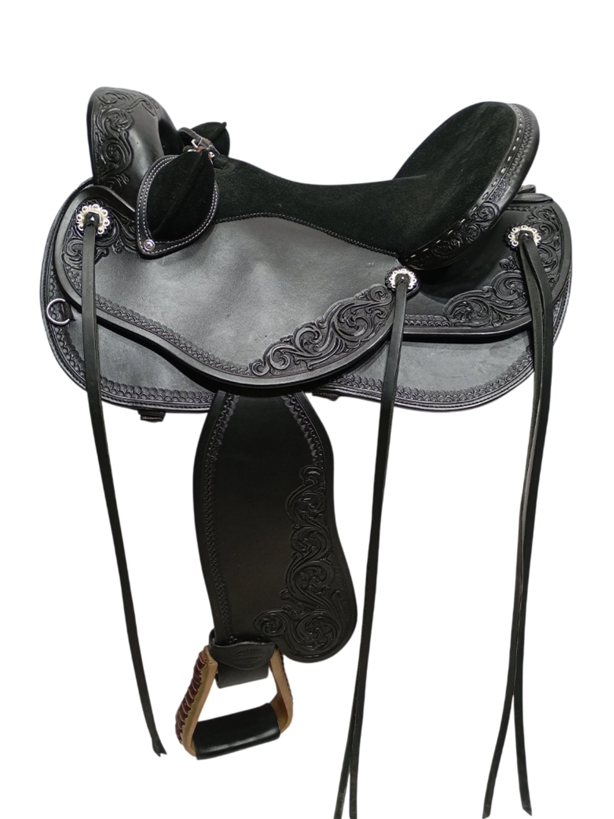 Extras: D-rings, Silver Slotted SX Berry Conchos with Latigo Strings, Crupper D-ring, Rawhide Stirrups with Black Leather Tread, Bucking Rolls in Black with White Stitching